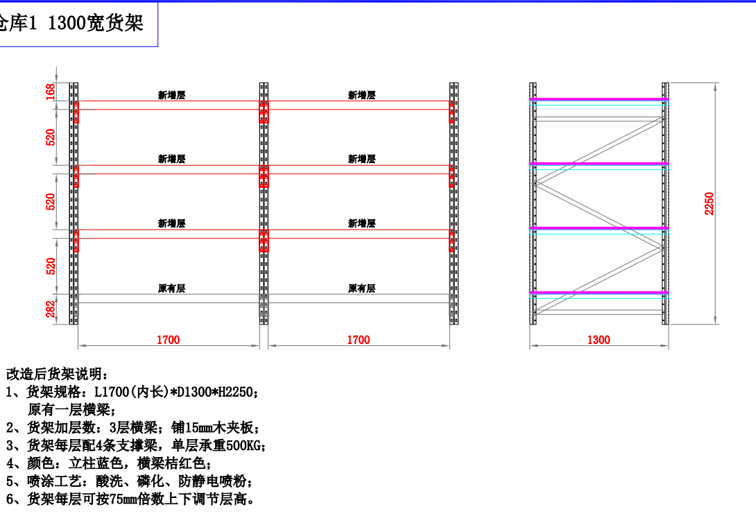 首先當(dāng)我們預(yù)留空間時,我們需要考慮很多因素。其中之一是貨架每層的高度。通常是根據(jù)貨物的高度來設(shè)計的??紤]到整個貨架的安全性,我們會根據(jù)貨物的高度留出更多的空間,這部分空間就是安全空間。因為如果儲物架的高度與貨物的高度相同,叉車將非常不方便取貨。它可能會與貨架碰撞和摩擦。如果你留出一定的空間,這個問題就可以解決.定制貨架尺寸為:長1700*寬1300*高2250 數(shù)量:4套 原有一層橫梁 2、貨架加層數(shù):3層 鋪15mm木夾板 貨架每層配4條支撐梁,單層承重500KG 每層可按75mm調(diào)節(jié)高度