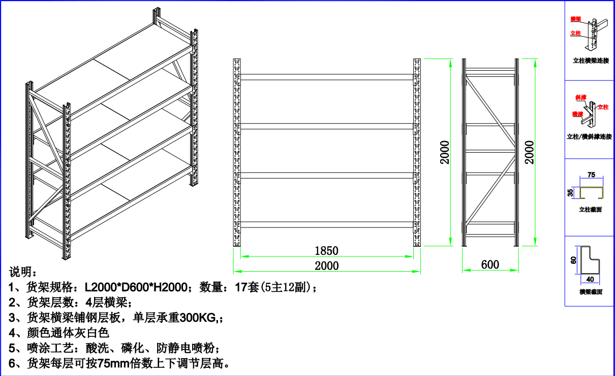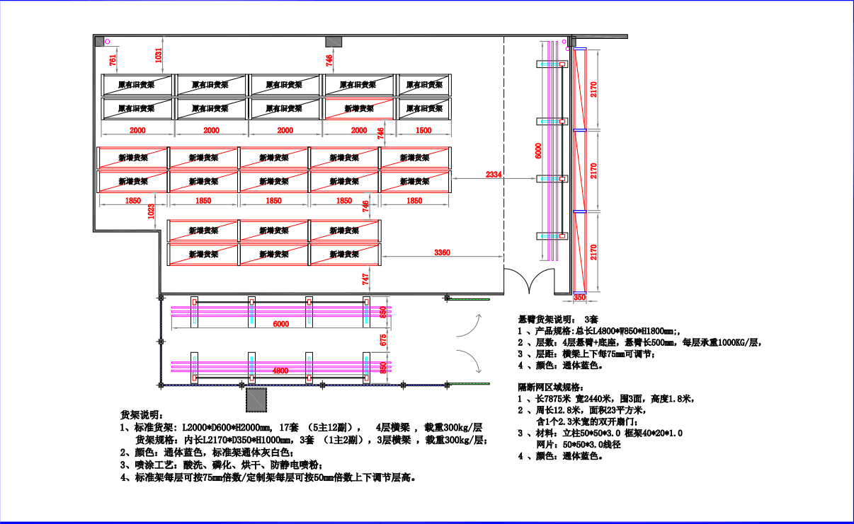 貨架說(shuō)明:標(biāo)準(zhǔn)貨架 L2000*W600*H2000 5主12副 4層橫梁 載重300KG/層 貨架規(guī)格:內(nèi)長(zhǎng)L2170*W350*H1000 顏色:通體藍(lán)色,標(biāo)準(zhǔn)貨架灰白色 3、噴涂工藝:酸洗、烘干、防靜電噴涂 標(biāo)準(zhǔn)貨架每層可按75mm倍數(shù)/定制架每層可按50mm倍數(shù)上下調(diào)節(jié)層高。