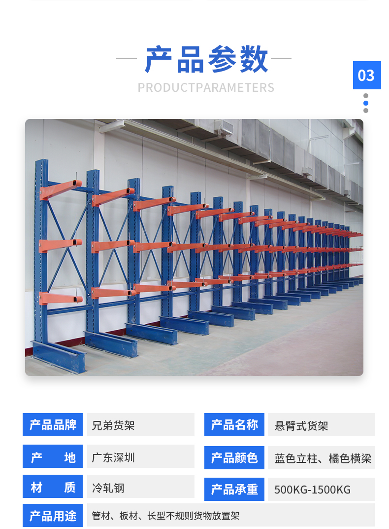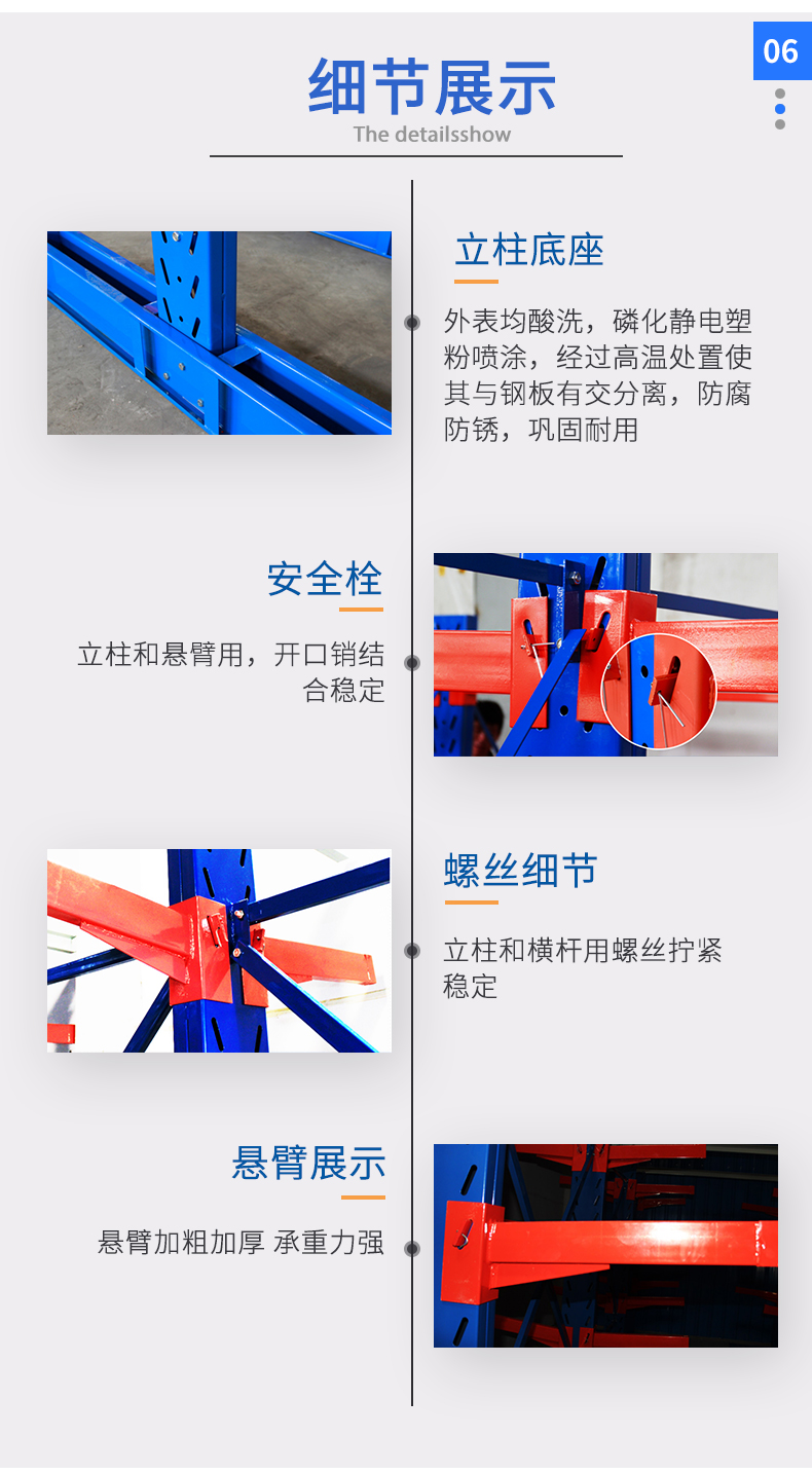 懸臂式貨架有單臂和雙臂之分,專用立柱型材,設(shè)計背拉增強穩(wěn)固型,高強度懸臂,每臂承重可達2T以上,高度依每100mm為單元上下調(diào)節(jié)